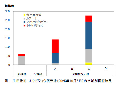 また、外来種のアメリカザリガニの採集数は例年より多かったのですが、大型個体は少なくなっています。そのためバイオマス(総重量)としては昨年より減少していました。