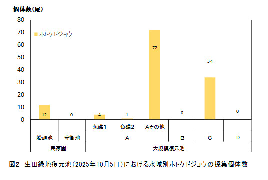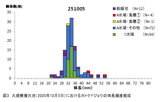 しかし、採集結果は大規模復元池で111個体、民家園の船頭池で12個体の合計123個体とまずまず悪くない数字で一安心でした(文末の図1、2)。大規模復元池では、民家園側(図1のA地点)と奥の池側(図1のC地点)のエリアにたくさんのホトケドジョウが集まっていて、当歳魚はほとんどがこの辺りで採集されました。